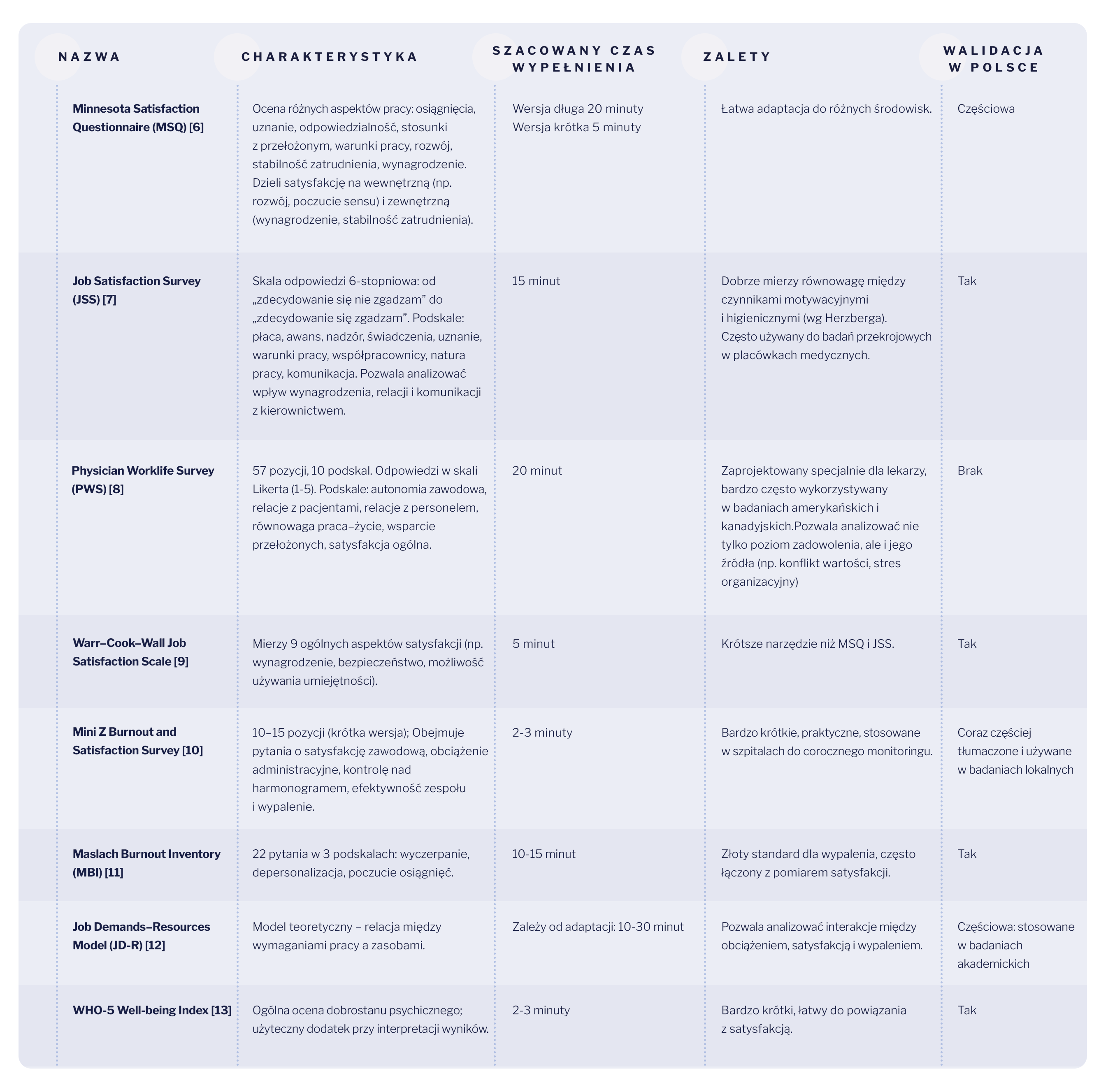 W Polsce wciąż brakuje jednolitego narzędzia do monitorowania satysfakcji zawodowej lekarzy w skali ogólnokrajowej. W badaniach środowiskowych stosuje się głównie autorskie kwestionariusze inspirowane MSQ czy JSS, obejmujące zwykle 10-20 pytań.