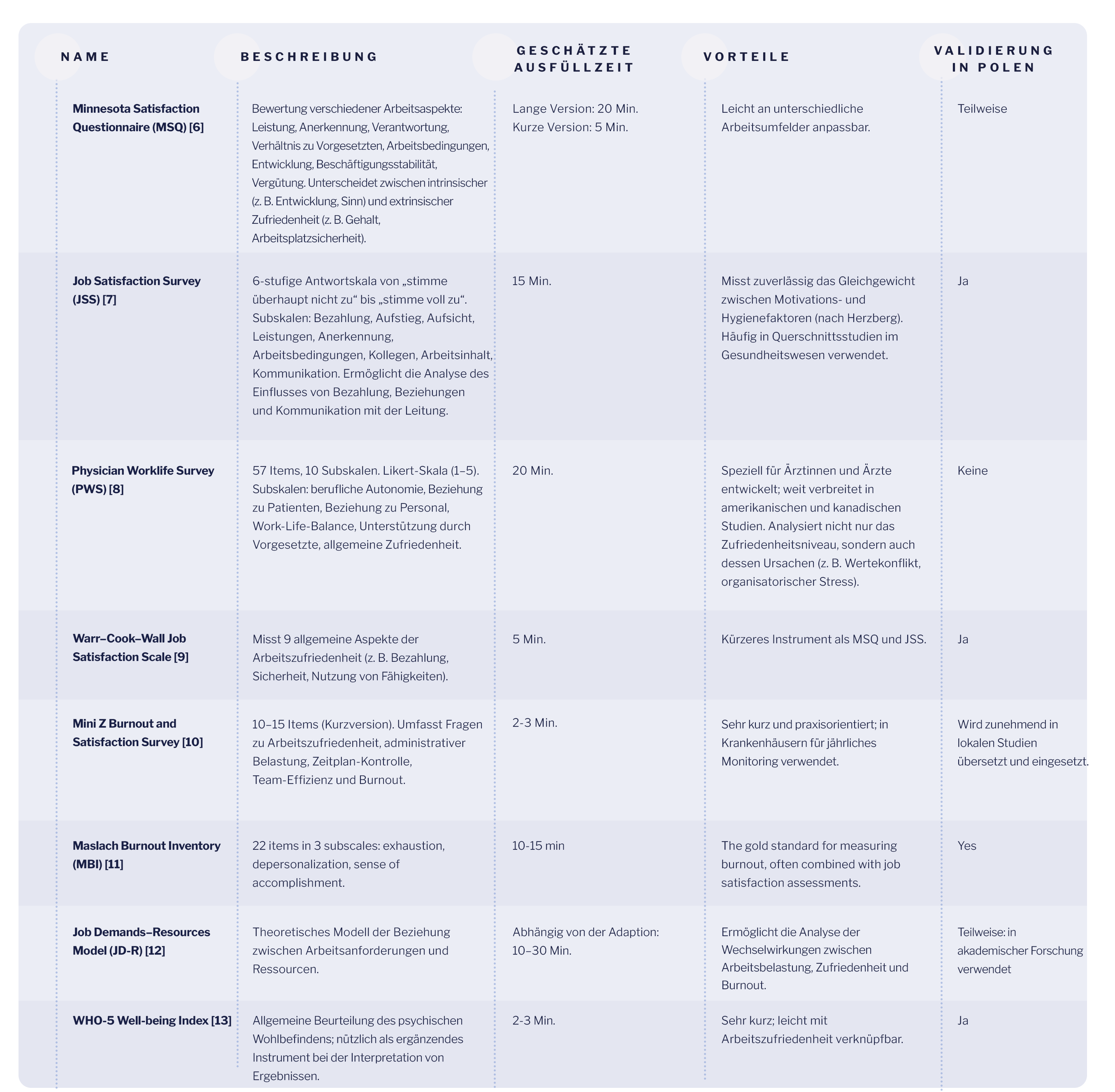 In Polen fehlt es immer noch an einem einheitlichen Instrument zur Überwachung der Berufszufriedenheit von Ärzten auf nationaler Ebene. In Umweltstudien werden hauptsächlich Fragebögen von Autoren verwendet, die von MSQ oder JSS inspiriert sind und in der Regel aus 10 bis 20 Fragen bestehen.