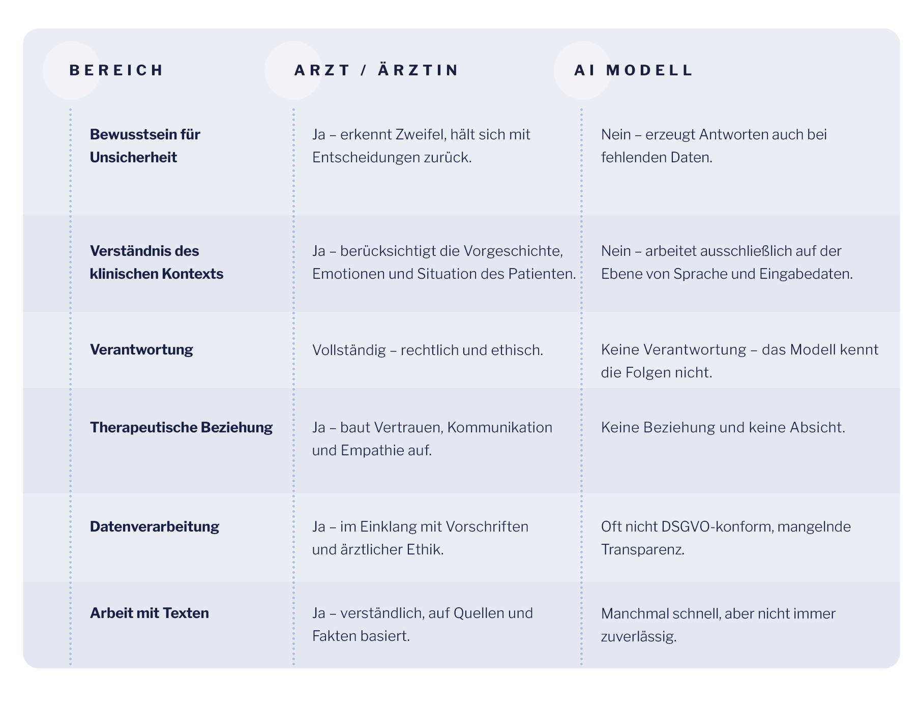 In diesem Artikel analysieren wir die wichtigsten Unterschiede zwischen einem Arzt und einer KI — nicht um sie zu bewerten, sondern um zu verstehen, wie effektiv mit Technologie zusammengearbeitet werden kann, während gleichzeitig die volle Verantwortung, die Patientenbeziehung und die Patientensicherheit gewahrt bleiben.