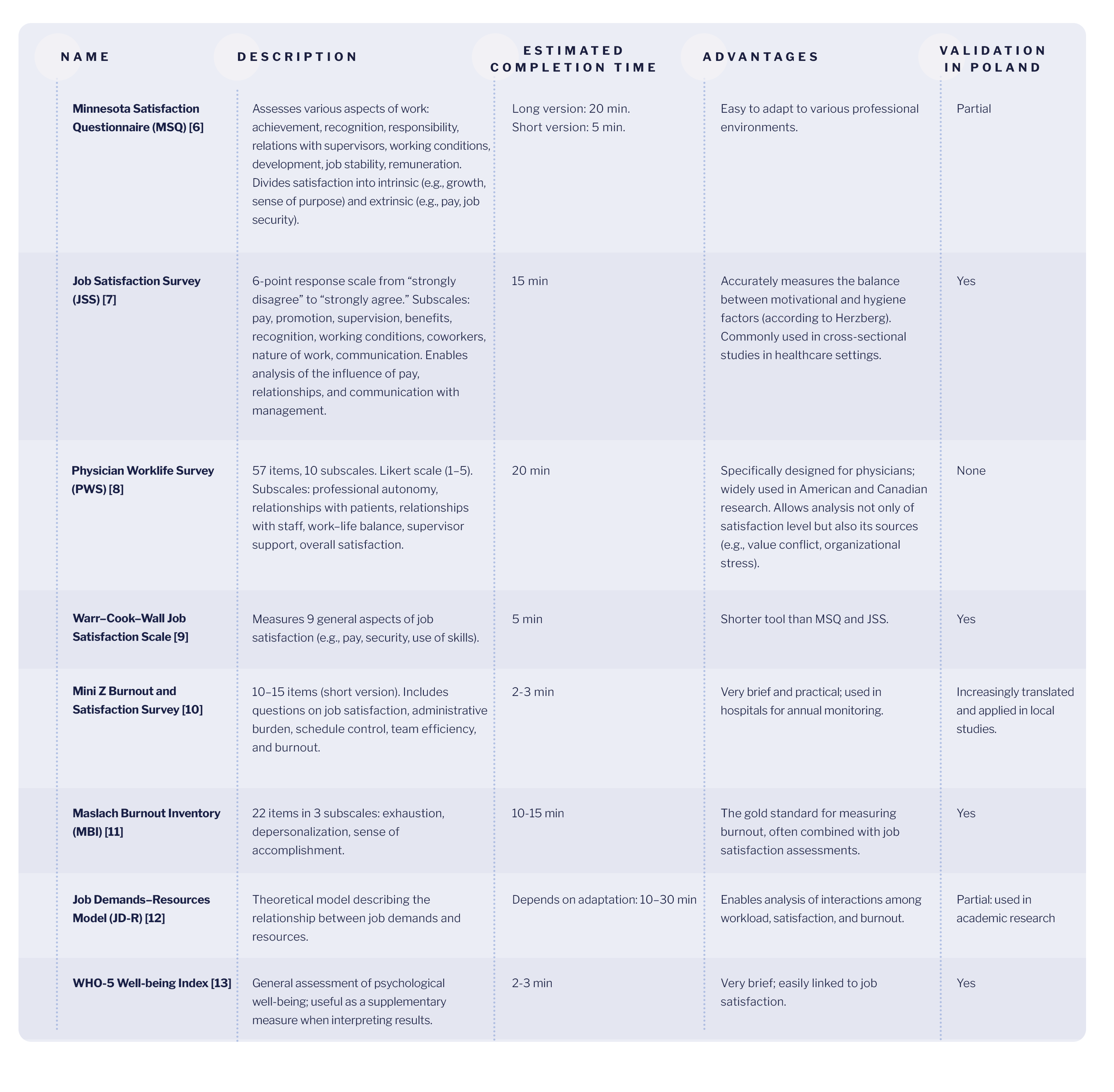 Measuring job satisfaction has been the subject of scientific research for years, not only for diagnostic purposes of the psychological well-being of doctors, but also as a predictive value of negative phenomena: staff turnover, burnout, decline in the quality of care and monitoring the effectiveness of interventions. In the medical environment, four main methods are used: